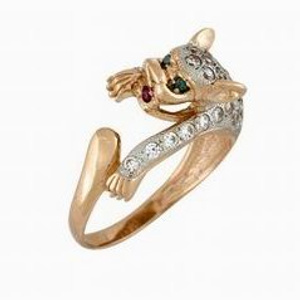 И еще - кольцо с пантерой в прыжке, также золото с россыпью циркония на спинке!Такое?