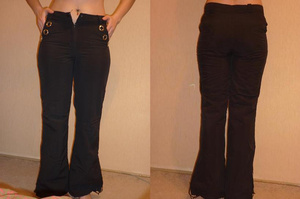 Джинсы черные, от колен не большой клеш. Размер 27 джинсовый, русский 42-44. Состав 100% cotton. Длина по внутреннему шву 78 см. Сломана пуговица (это сейчас не проблема, сама бы сделала, но времени нет). Цена 100 руб.
