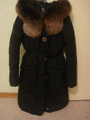 Пуховик в отличном состоянии с мехом енота и широким лаковым поясом, воротник-стойка, смотрится очень стильно. Размер 44, цена снижена! 3000р