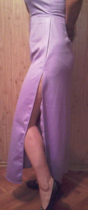 И очень сдержанное платье, его можно обыграть за счет украшений или накидки. Сиреневое. Разрез сбоку и замочек через всю спинку. Приталенное. Размер 46-48. Цена 500 руб.