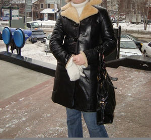 Дубленка кожаная на овчине. Размер 46-48. Верх черный, овчина светлая, приталенная на поясе без капюшона, очень теплая.Длина на рост 176 до колена.