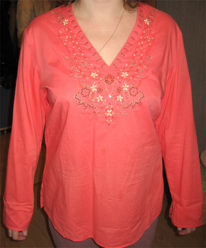 Туника кораллового цвета с этнической вышивкой.