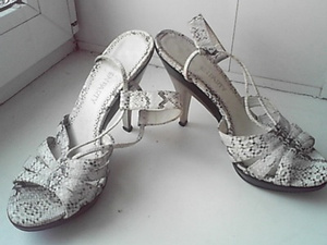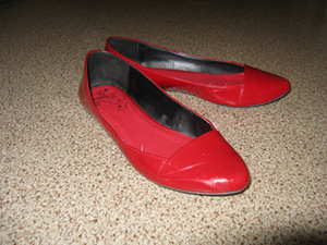красные лаковые босоножки на танкетке(она имитирует пробку, но не пробка), высота в носочной части 3см, под пяточкой 13см. размер 38. состояние очень хорошее. 300р