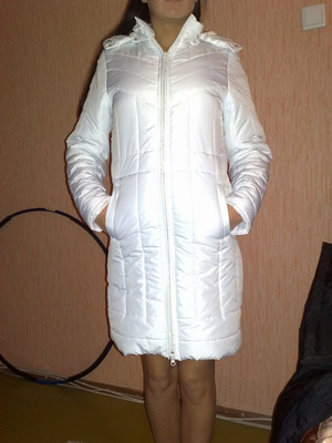 Еще вот такое пальтишко. Размер 42-44, рост 165-168. На синтепоне, с капюшоном, капюшон оторочен исскуственным мехом. Чисто белое. На поясе внутренняя кулиска. Практически не ношенное. Дочь одевала пару раз. Цена 500 руб.
