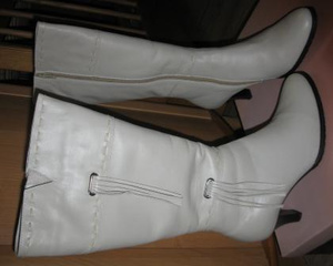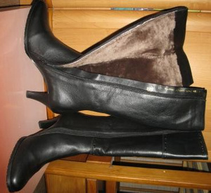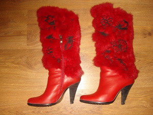 Натуральная кожа, натуральный мех. Высота каблука 7 см., обхват голенища в самом широком месте - 19 см., в самом узком - 12,5 см. Подойдут на ногу средней полноты.
