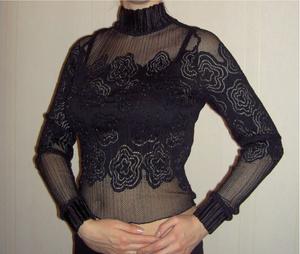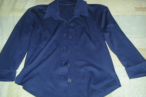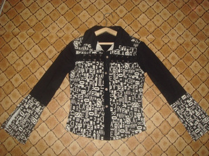 Продам черную рубашку с белым графическим рисункам, хлопок с чем-то эластичным, немного тянется, спереди декорирована тонкими ленточками из черной замши, такие же ленточки были на рукавах (шнуровка), но утеряны, на фото видно, где они были. Б/у, но за счет качественной ткани особо в процессе носки не пострадала, размер 38-40 российский, скорее на девочку-подростка, длина рукава - 57см, длина плеча - 11,5см. Цена - 100 руб.