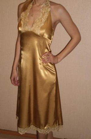 Эластичный атлас золотого цвета, сзади небольшой шлейф, украшено золотым кружевом.Размер 44-46, на грудь 2-3 размера. (на рост примерно 1,68 м)