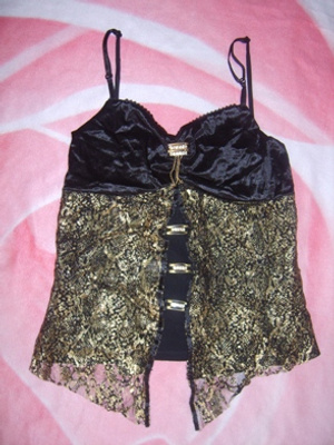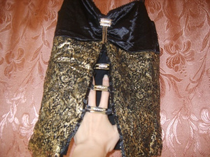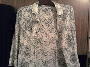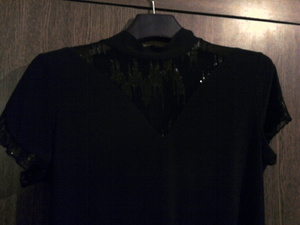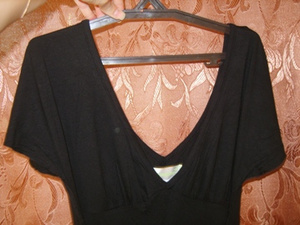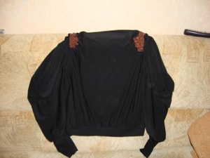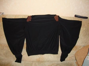 Кофта. Черная, материал - трикотаж, размер ближе к 46. Интересно выполнены рукава, мне сложно объяснить, на первой фотографии в разложенном виде, на втором, примерно так будет выглядеть, если ее одеть (разрез, нисподают мягкими складками). Над рукавами украшение - расшита золотисто-коричневым бисером. Кофта одевалась один раз, лежит без дела (не подходит размер). На фото отсвечивает какие-то полосы, в реале их нет, цвет - чистый черный. Цена - 300 рублей.