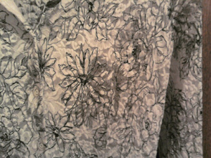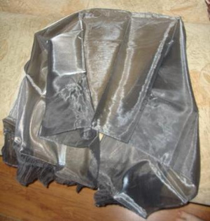 И напоследок. Шарфик из органзы НОВЫЙ, цвет - металлический серый (серебристый). Может, кому пригодится к Новогоднему наряду. Подарок от Ив Роше, у меня таких 2. Снизу немножко плессировки. Ширина - 48 см. Цена - 100 рублей.