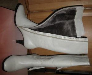 Натуральная кожа, натуральный мех. Высота каблука 7 см., обхват голенища в самом широком месте - 19 см., в самом узком - 12,5 см. Подойдут на ногу средней полноты.