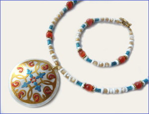 Кроме того, возможен такой комплект в другой цветовой гамме - красный с зеленым: вот такой кулон и подвески для серег.