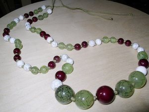 Бусы длинные 85 см., круглые бусины с эффектом микротрещин (белые, коричневые и светло-зеленые прозрачные), на завязках. Цена 200 рэ.