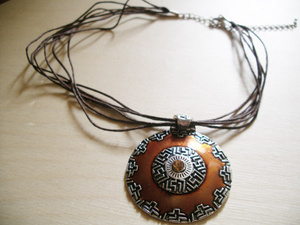 Колье в греческом стиле. Круглая подвеска диаметр 5 см. на нескольких нитях. Коричнево-медная гамма. Цена 150 рэ.