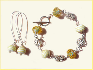 Лэмпворк мастерской Остин Гамильтон (Канада), с обеих сторон каждой стеклянной бусины - сверкающие кристаллы Сваровски цвета Golden Shadow, вся фурнитура посеребренная. Удлиненные швензы-петли по желанию можно заменить на классические швензы либо пуссеты. Браслет на запястье примерно 18 см.