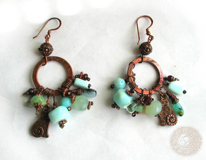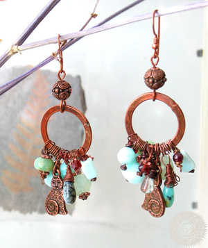 Голубые опалы, бирюзовые халцедоны, зеленые аметисты, прозрачный кварц, гранаты, фурнитура - окисленная медь. Длина от швензы 5,7 см. 990р