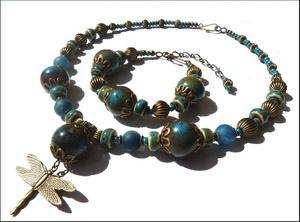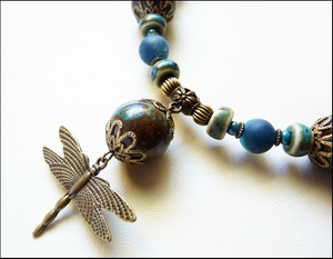 Бусы - керамика, матированный агат, латунная фурнитура, подвеска-стрекоза в винтажном стиле. Длина без подвески 45 см (возможно добавить удлинительную цепочку).