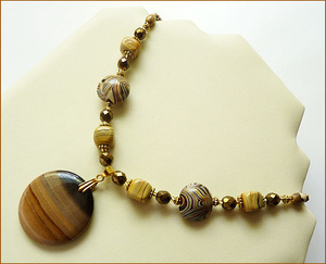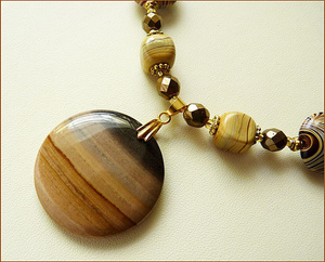 Кулон прекрасного качества из полосатой яшмы (диаметр 4 см), лэмпворк, стекло, пейзажная яшма, застежка - позолоченный крючок. Длина до кулона 48 см (есть возможность дополнить удлиняющей позолоченной цепочкой).