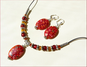 Миллефиори, металл, стекло, кожаный шнур (длина 43,5 см). Серьги на застегивающихся посеребренных швензах.