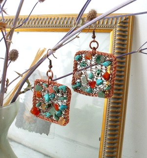 ручная работа. медь, сердолик, нефрит, говлит под бирюзу. длина застегнутого браслета 19см (можно удлиннить) 1100 р.бонус к браслету - серьги . Длина от швензы 4,5 см, ширина 3,7 см