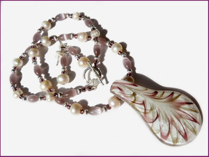 Лэмпворк-кулон, посеребренная фурнитура, натуральный жемчуг (диаметр 9 мм и 7 мм), стеклянный кошачий глаз. Серьги-пуссеты. Размер кулона 6х3,5 см, длина до кулона 46 см.
