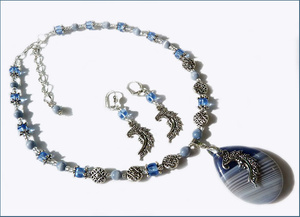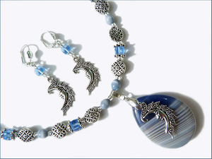 Кулон из агата (4,5х3 см), длина до кулона - 41 см (+7 см удлиняющая цепочка). Застегивающиеся швензы серег, застежка кулона и удлиняющая цепочка посеребренные. Длина серег от швензы 4 см.
