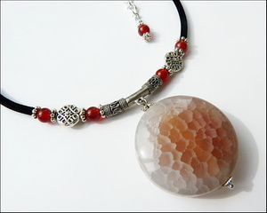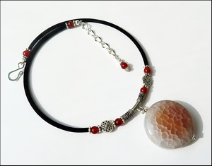 Fire-агат с редким голубовато-пепельным оттенком по периметру кулона (диаметр 4 см, толщина 1 см), карнелиан, металлофурнитура, посеребренные застежка и удлиняющая цепочка, мемори-основа для колье, бархатный шнур. Длина по окружности 41 см (+5 см удлиняющей цепочки).