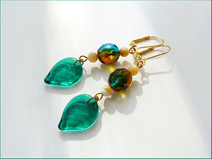 Чешское стекло, швензы серег - позолоченная медсталь. Легкие бусики длиной 46 см, длина серег от швензы - 4 см.