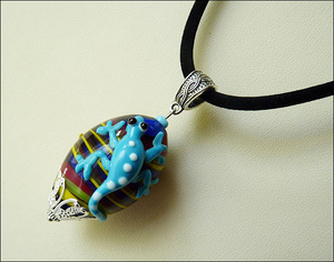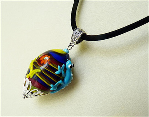Лэмпворк-кулон из разноцветного непрозрачного стекла с объемной ящеркой на бархатном шнуре (длина шнура по вашему желанию, от 40 до 55 см). Размер кулона - 4,5х2,5 см, за счет того, что он не плоский, а овально-яйцевидной формы, выглядит довольно массивным.