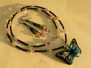 "Голографический" кулончик + серьги к нему. Дихроическое стекло, кристаллы Сваровски, бисер, металлофурнитура, ювелирный тросик. Длина по шнуру — 47 см. Размер подвески — 4х3 см. Дихроическое стекло содержит многократные микрослои окисей различных металлов (золото, серебро, титан, хром, алюминий, цирконий, магний, кремний), из-за которых оно приобретает особые оптические свойства — переливающиеся сверкающие слои меняют свой цвет в зависимости от угла обзора. 850 руб.