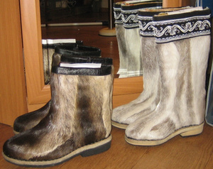 Была прошлой зимой в Улан-Удэ - там такие унты и камусы продаются, на рынке есть магазинчики, в которых из обуви только они и продаются, стоят 6-7 тысяч, из оленьего меха, по верху расшиты стразами, бусами, бисером или с кожаной апликацией.