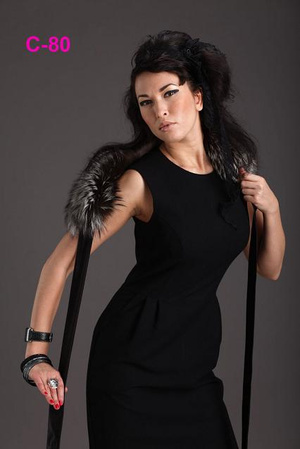 Приталенная, без пояса. Отделка искуственным мехом под горностай. Капюшон утеплен этим же мехом. Узкий слой идет по низу и по рукавам. Не отстегивается.