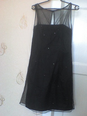 черное платье на брителях.одевалось один раз на Новый год))Сверху сеточка,под сеточкой ткань,а на ткани редкие стразы.цена 500 рублей.размер 46-48