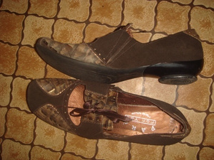 Закрытые туфли, нубук, кожа, каблучок - 2см, размер 37, шнуровка-обманка с атласной лентой, по бокам вставлены незаметные резиночки для удобства надевания. Б/у 1 раз, оказались малы. 400 руб.
