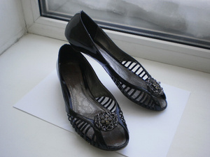 Туфли -балетки,б/у,натуральный лак,открытый нос,украшение в виде броши с камнями,размер 38,цена 400р.