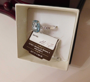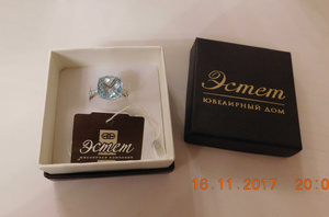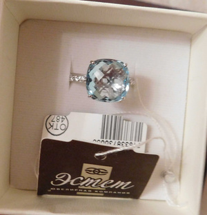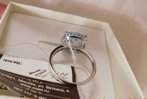 Кольцо новое, с биркой, из белого золота 585 пробы с крупным топазом 17,58 ct (Бриолет антик 12*12) чистого голубого цвета и фионитами, р-р 19, производитель " Эстет". Цена 9500 руб.