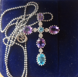 Колье крест с цепочкой, бриллианты, топазы, аметисты, производитель «Ивел», новое, длина цепочки 40 см, 35000 руб.