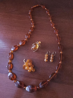 1. Янтарь - массивные бусы (70 см), брошь "Жук" (латунь, золото), брошь "Ягоды", серьги.