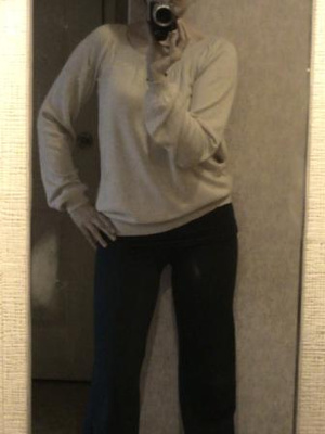 продам костюм для будущих мам, размер 50, абсолютно новый, куплен в мама маркете, капри и жилет, цвет серый с красной отделкой. у девушки на фото еще водолазка.