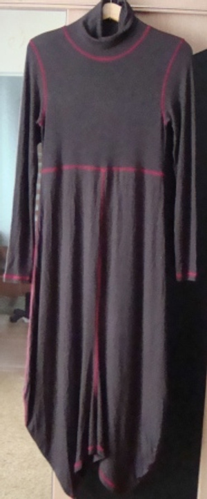 продам необычное платье, трикотаж, плотный, цвет коричневый, с красной отделкой, дело в том что внизу это платье скреплено, вроде как брюки