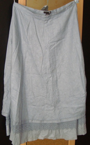 размер 44-46, цену предлагайте.юбка, длинная, пышная, из мятой ткани, цвет серо-голубой, очень интересная отделка, там и сборки и кружева... размер 44-46, цена 400р, торг.