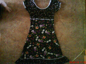 продам платье черное, в цветочек, отделка низа и рукавов -белый гипюр. рукава фонарики, внизу волан. Стрейч размер 44-46. 350 руб