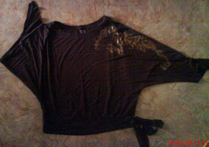 блузу-летучую мышь INCITY 44 размер душевная ткань, цвет -горький шоколад аппликация-золотом, вырез горловины-большой. можно оголить плечико. носила с разноцветными бретелями под сапоги, брюки. 400 руб