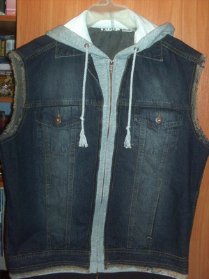 Мужской стильный джинсовый жилет с трикотажным капюшоном с эффектом 2 в 1. Трикотаж не съемный. Германия, фирма Y.O.U. Новый, но без этикетки. размер 48 (L), подойдет и на 50, мне кажется. Вредный муж носить отказался(