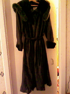 Цвет - болотный, оливковый. Капюшон и манжеты из искусственной каракульчи цвета мха. Капюшон оторочен изумрудным песцом.
