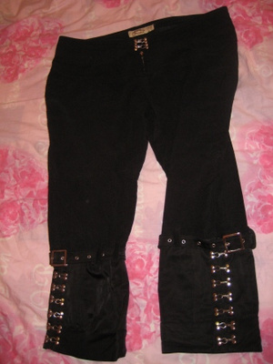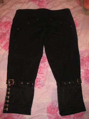 Стильные капри для "выбражулек" 46р-ра, комбинированые вельвет (до колена) и атлес (от колена и ниже). по бокам-крючки, можно их расстегнуть, вокруг колена, ремешки тканевые,талия занижена, на талии тоже на крючках, модель оч. интересная.700руб.