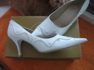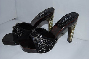 заказывала в американском магазине, но мне малы. размер на 37,5-38 идут. внешняя сторона - тканевая. удобные. каблук примерно 9,5 см