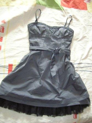 продам платье Promod, серого цвета в тонкую черненькую полосочку, на тонких бретельках, с поясом (можно завязывать как спереди, так и сзади), спереди есть кармашки (их не видно)