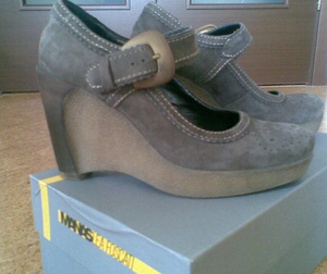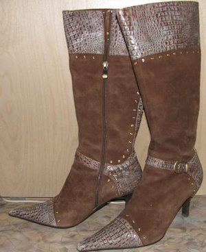 пристраиваю туфли, мне малы. темно-коричневые, абсолютно новые. размер 37,5-38. внешняя сторона - тканевая. колодка удобная. каблук примерно 9,5 см