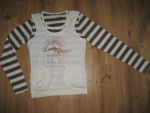 Кофта коричнево-бежевая. Состоит из 2 частей: майка с длиным рукавом и майка с коротким рукавом. Можно носить по отдельности.Размер 42. Цена 250 руб.