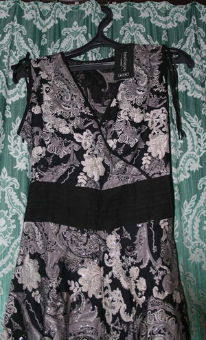 Очень красивое и стильное платишко Promod. Материал - атлас. Расцветка очень интересная (сине-серо-черное), красивое сочетание цветов. Можно носить с поясом (под грудью завязывается) либо без. Размер 44-46.